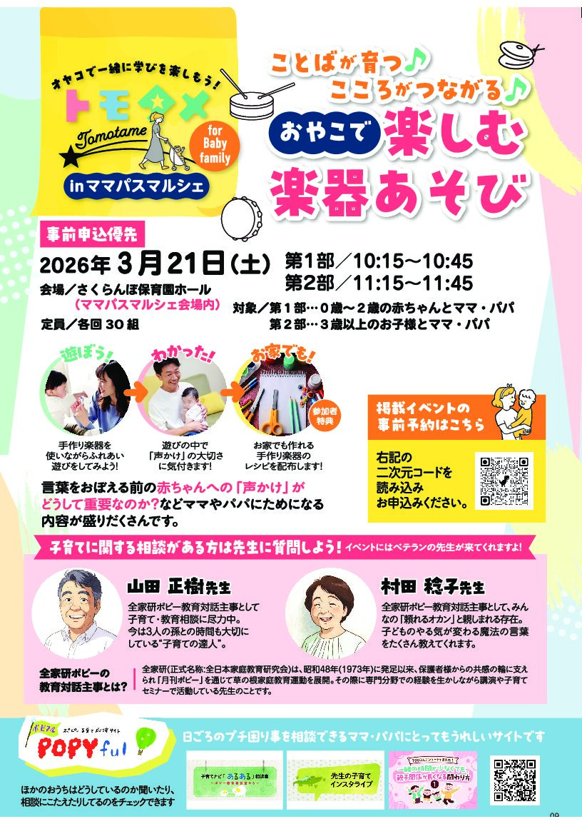 「おやこで楽しむ楽器あそび」の申込を2月24日10:00からオンラインで始めます。